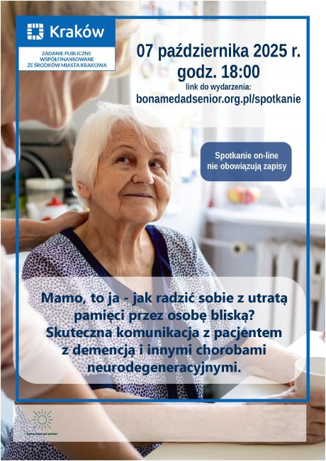 Serdecznie zapraszamy wszystkie osoby opiekujące się osobami starszymi i seniorów na wykład on-line pt.: "Mamo, to ja - jak radzić sobie z utratą pamięci przez osobę bliską? Skuteczna komunikacja z pacjentem z demencją i innymi chorobami neurodegeneracyjnymi”.