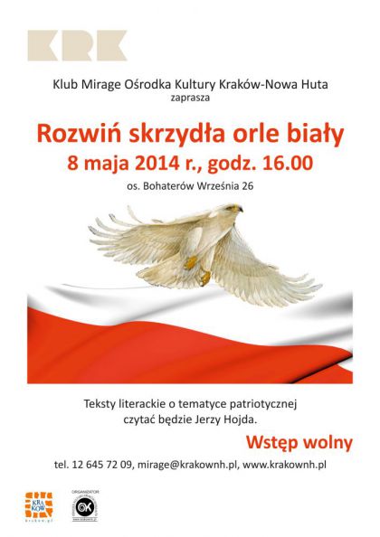 Klub Mirage Orodka Kultury Krakw-Nowa Huta (os. Bohaterw Wrzenia 26) zaprasza 8 maja o godz. 16.00 na spotkanie z okazji obchodw rocznicy podpisania Konstytucji 3 Maja. Teksty o tematyce patriotycznej czyta bdzie krakowski aktor Jerzy Hojda.