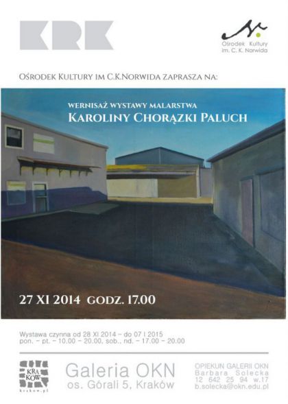 Karolina Chorzka-Paluch: ur 1984 r. w Krakowie, ukoczya Akademie Sztuk Piknych im. Jana Matejki w Krakowie. Wydzia Malarstwa; w Pracowni prof. Adama Wsiokowskiego, dyplom z wyrnieniem. Na wystawie w Galerii OKN zaprezentuje swoje najnowsze prace.