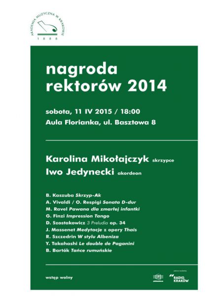 | W sobot 11 kwietnia o godzinie 18:00 w Auli Florianka (ul. Basztowa 8) odbdzie si koncert duetu skrzypcowo-akordeonowego Karoliny Mikoajczyk i Iwo Jedyneckiego studentw Uniwersytetu Muzycznego Fryderyka Chopina w Warszawie, ktrzy w listopadzie 2014r. otrzymali nagrod Rektorw Polskich Uczelni Muzycznych oraz Nagrod Stowarzyszenia Autorw ZAiKS. W ramach tej nagrody modzi muzycy wystpuj w Salach Koncertowych wszystkich Uczelni Muzyczn(...) ... więcej » |