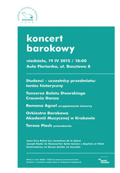 Muzyk i taniec w wiecie francuskiego baroku bdzie mona usysze i zobaczy podczas niedzielnego koncertu 19 kwietnia o godzinie 18:00 w Auli Florianka przy ul. Basztowej 8. Na scenie zaprezentuj si studenci przedmiotu taniec historyczny, tancerze Baletu Dworskiego Cracovia Danza pod dyrekcj Romany Agnel oraz Orkiestra Barokowa Akademii Muzycznej w Krakowie, ktr poprowadzi Teresa Piech.