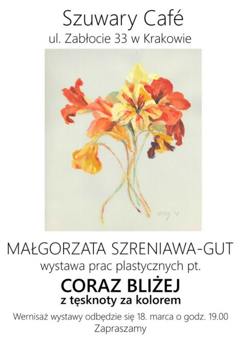 Szuwary Cafe (ul. Zabocie 33) zaprasza w pitek (18.03) o godz. 19.00 na wernisa wystawy prac plastycznych Magorzaty Szreniawy-Gut Coraz bliej. Z tsknoty za kolorem, wstp wolny,(...)  ... więcej »