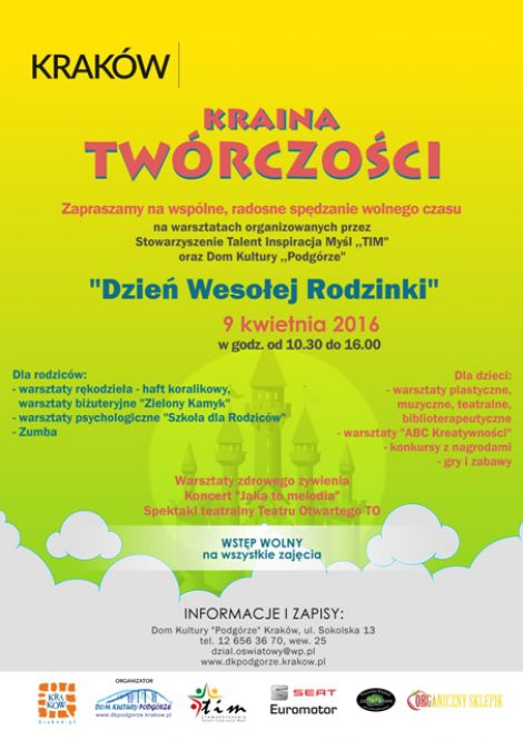 Dzie wesoej Rodzinki w programie: warsztaty rkodziea, warsztaty psychologiczne, warsztaty plastyczne, muzyczne, teatralne, konkursy z nagrodami, gry i zabawy(...) ... więcej » |