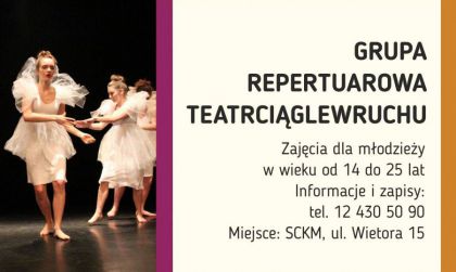 | Pracownia Taca Wspczesnego zaprasza modzie w wieku od 14 do 25 lat do Grupy Repertuarowej "TeatrCiglewRuchu". Grupa przygotowuje i prezentuje spektakle taneczne oraz projekty interdyscyplinarne. Choreograf w swojej pracy opiera si na indywidualnych moliwociach i zdolnociach ruchowych tancerzy oraz wykorzystuje ich potencja osobowociowy w procesie tworzenia choreografii. W grupie tej spotykaj si zarwno osoby z dowiadczeniem scenicz(...) ... więcej » |
