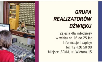 | Zapraszamy modzie w wieku od 16 do 25 lat do Grupy Realizatorw Dwiku. Uczestnicy zaj zdobywaj wiedz na temat realizacji audycji radiowych, obrbki materiaw dwikowych i podstaw prawnych licencji CC. Najcenniejsz pierwsz praktyk w zawodzie realizator dwiku zdobywaj w internetowym radiu Pryzmat. Tutaj podczas codziennych audycji prowadzonych przez modych adeptw sztuki dziennikarskiej, pracuj realizatorzy dwiku, ktrzy czuwaj(...) ... więcej » |