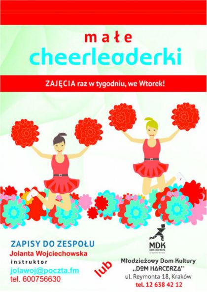 | Cheerleaderki zapraszaj na zajcia we wtorki w godzinach od 17.40 do 19.15. Nowa sala baletowa, nowe wyzwania i moliwoci! W ramach zespou prowadzone s zajcia dla Cheerleaderek z elementami taca towarzyskiego. Wiek uczestnikw 6-12 lat. Zapraszamy!(...) ... więcej » |