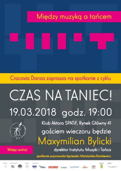 | Kolejne spotkanie cyklu CZAS NA TANIEC!, ktre odbdzie si w poniedziaek 19.03.2018, o godz. 19, w Krakowie, w Klubie Aktora SPATiF (Rynek Gwny 41) otrzymao tytu Midzy muzyk a tacem. Gociem wieczoru bdzie Maxymilian Bylicki, od paru miesicy dyrektor Instytutu Muzyki i Taca, pianista, menader, dziaacz spoeczny, organizator ycia artystycznego. Temat spotkania prowokuje do rozwaa nie tylko na temat mariau muzyki i taca, ale prze(...) ... więcej » |