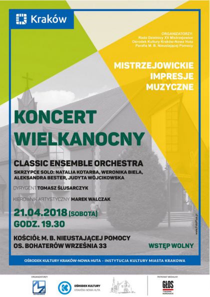 W sobot 21 kwietnia br. o godzinie 19.30 w kociele pw. Matki Boej Nieustajcej Pomocy na os. Bohaterw Wrzenia 33 odbdzie si Koncert Wielkanocny w ramach cyklu Mistrzejowickie Impresje Muzyczne. Podczas tego koncertu zainauguruje swoj dziaalno artystyczn Classic Ensemble Orchestra. Jest to zesp zoony z absolwentw oraz studentw krakowskiej Akademii Muzycznej.