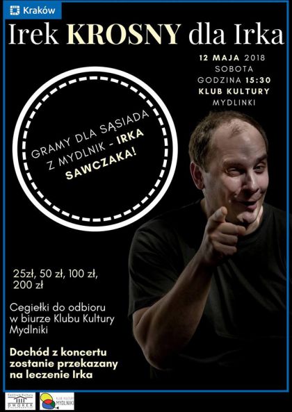 | Szanowni Pastwo kwestia niezwykle wana i warta zatrzymania! Mianowicie 12 maja 2018 roku o godz. 15.30 odbdzie si CHARYTATYWNY WYSTP najsynniejszego polskiego mima Ireneusza Krosnego na rzecz mieszkaca Mydlnik- Ireneusza Sawczaka chorujcego na zoliwy nowotwr mzgu. Artysta wystpi z nowym programem pt. Mowa ciaa. Dochd z wystpu zostanie przekazany na leczenie Irka Sawczaka , cegieki w cenie 25 z, 50 z, 100 z, 200 z mona (...) ... więcej » |