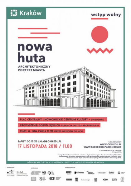 Zwiedzanie Placu Centralnego i budynku Nowohuckiego Centrum Kultury w ramach projektu Nowa Huta architektoniczny portret miasta. Prowadzenie: Dorota Jdruch (Fundacja Instytut Architektury). Zapisy do 15 XI: j.klas@okn.edu.pl. Wstp wolny.