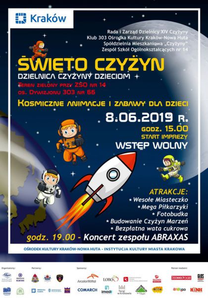 | Rada i Zarzd Dzielnicy XIV Czyyny, Orodek Kultury Krakw-Nowa, Spdzielnia Mieszkaniowa Czyyny i Zesp Szk Oglnoksztaccych nr 14 im. w. Brata Alberta (na ktrego terenie odbdzie si wydarzenie) zapraszaj na tegoroczne wita Czyyn, ktrego tematem bdzie KOSMOS. Uczestnicy imprezy zostan zaproszeni do astronautycznej strefy zabaw, w ktrej czeka bdzie na nich budowanie kosmicznych Czyyn Marze stacji orbitalnych i rakiet, p(...) ... więcej » |
