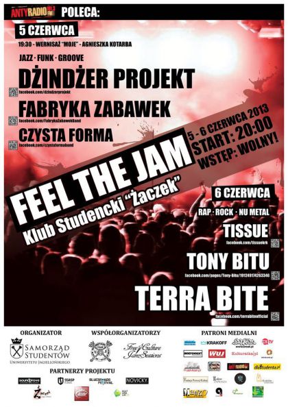 FEEL THE JAM, to dwudniowy muzyczny event podsumowujcy nasz caoroczn dziaalno oraz postpy nad projektem. Wspln klamr czc dwa dni prawdziwego muzycznego wita jest oczywicie muzyka improwizowana, dlatego oprcz wietnych wystpw, przygotujcie si take na mas emocji po koncertach, podczas JAM SESSION!