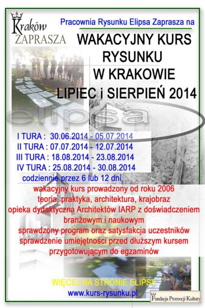 Jak kadego roku, zapraszamy na kurs rysunku odrcznego organizowany przez pracowni rysunku Elipsa w Krakowie. Zajcia prowadzone przez Architektw IARP, czonkw Stowarzyszenia Architektw Polskich, doktorantw Wydziau Architektury Politechniki Krakowskiej. Wakacyjny kurs rysunku prowadzony w Krakowie to idea, ktra powstaa w 2006 roku w naszej pracowni, gdy takich kursw jeszcze praktycznie nie byo. Wakacyjne kursy rysunku z zaoenia przekazuj podstawow wiedz n.t. architektury i rysunku odrcznego, wymaganego przy egzaminie wstpnym. Kandydat moe dziki kursom wakacyjnym zapozna si z podstawami rysunku, zobaczy jak wygldaj profesjonalnie wykonane rysunki oraz zakres tematyczny na egzaminie wstpnym, zapozna si z zasadami pracy architekta i podj decyzj, czy zawd ten bdzie w przyszoci odpowiedni do samorealizacji, a ostatecznie zadecydowa o uczestnictwie w kursie caorocznym, przygotowujcym profesjonalnie do egzaminu wstpnego.