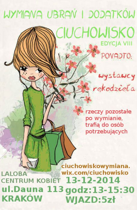 Kolejna edycja szalonej wymiany ubra i dodatkw czyli Krakowskiego Ciuchowiska. Tym razem spotykamy si nieco dalej od centrum w LaLoba Centrum Kobiet na ul.Dauna 113. Na stali due lusta, dobre wiato i przestrze do wymiany. W mniejszej sali bd rzeczy dziecicen i inne a wikszej kobiece i mskie:) Wymiana odbywa si bdzie na stoach. Na miejscu barek z piciem i jedzonkiem:)