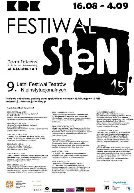 30.08. niedziela, g. 20:00 Sala iluzji z cyklu Teatralny Hyde Park re. Ziuta Zajcwna, wystpuj: Mateusz Dewera, Sara Gawlik, Katarzyna Ilnicka, Piotr Majewski, Justyna Orzechowska, Beata Paluch, Ziuta Zajcwna. Muzycy: Monika Bylica, Andrzej Wodarz. "Kady czowiek aby si nie zama musi od czasu do czasu mie w yciu jaki sukces po cenach sztywnych (Wiesaw Brudziski)".