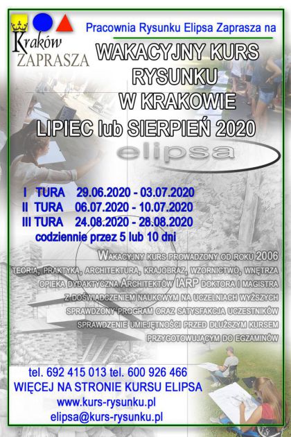 Zapraszamy osoby zainteresowane kandydowaniem na studia lub sprawdzeniem si w meandrach rysunku odrcznego w trakcie kursu wakacyjnego 2020 w lipcu lub w sierpniu. Zajcia pozwalaj nie tylko pozna arkana tej piknej sztuki w zakresie architektury i projektowania oraz rwnie zwiedzi Krakw i ciekawe miejsca w miecie. W trakcie zaj planujemy wizyt m.in w Ogrodzie botanicznym, Cricotece, dzielnicy Kazimierz, Podgrze, Muzeum lotnictwa i innych nowoczesnych i historycznych lokalizacjach.