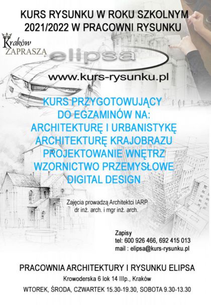 Zapraszamy osoby zainteresowane kandydowaniem na studia lub sprawdzeniem si� w meandrach rysunku odr�cznego w trakcie kursu wakacyjnego 2021 w lipcu lub w sierpniu. Zaj�cia pozwalaj� nie tylko pozna� arkana tej pi�knej sztuki w zakresie architektury i projektowania oraz r�wnie� zwiedzi� Krak�w i ciekawe miejsca w mie�cie. W trakcie zaj�� planujemy wizyt� m.in w Ogrodzie botanicznym, Cricotece, dzielnicy Kazimierz, Podg�rze, Muzeum lotnictwa i innych nowoczesnych i historycznych lokalizacjach.