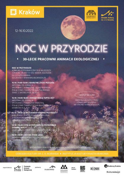 Zaproszeni goście przybliżą sekrety z życia pszczół oraz nocnych spacerów jeży. Ważny problem zanieczyszczenia światłem zostanie omówimy podczas webinarium pt. „Kto w przyrodzie potrzebuje ciemnej nocy?”. Prezentacja zdjęć i filmów z leśnych fotopułapek będzie okazją do podglądania nocnego życia lasu. Nie zabraknie również wydarzeń warsztatowych, podczas których będziemy tworzyć świece z pachnącego miodem wosku pszczelego, a także uczyć się budować domki dla jeży. Wydarzenia realizowane w ramach projektu Ogrody Nowej Huty. Partner: ArcelorMittal Poland.