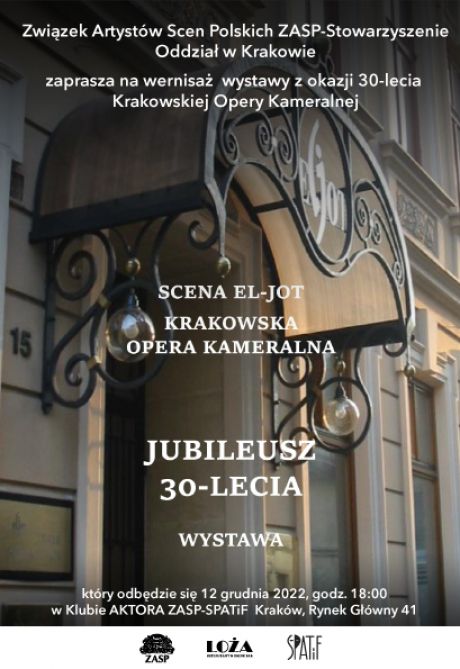 zaprasza na wernisaż wystawy z okazji 30-lecia Sceny EL-JOT Krakowskiej Opery Kamery Kameralnej, który odbędzie się 12 grudnia 2022, godz. 18:00 w Klubie Aktora ZASP-SPATiF Kraków, Rynek Główny 41