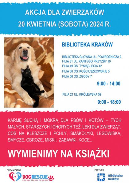 W tych miejscach będzie trwała zbiórka darów dla bezdomnych psów i kotów, a w zamian za dar dla zwierzaka, będzie można wrócić do domu z wybraną książką.