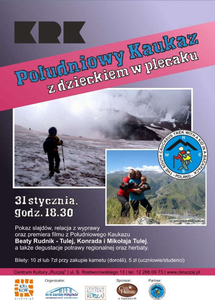 Zapraszamy na spotkanie z rodzinš Tulejów, realizujšcš autorski projekt podróżniczo - wspinaczkowy "Z dzieckiem w plecaku", w ramach którego wraz z synem Mikołajem przemierzajš wiat i zdobywajš najwyższe szczyty Kaukazu, co roku zapuszczajšc się coraz dalej i coraz wyżej. piš w namiocie, podróżujš jak najtaniej lokalnymi rodkami transportu, a także sami organizujš sobie wyżywienie.