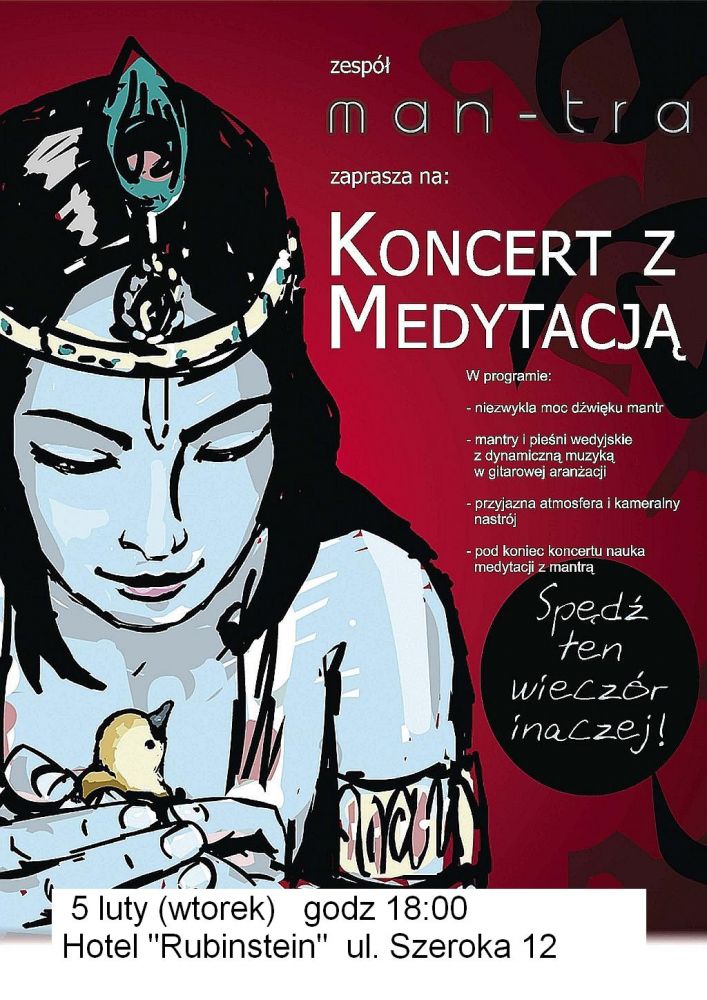 Zesp muzyczny "Man-tra" zaprasza na relaksujcy wieczr ze staroytnymi mantrami i pieniami wedyjskimi w nowoczesnej i dynamicznej aranacji muzycznej. Pod koniec koncertu nauka medytacji, dziki ktrej kady, kto chce, moe zabra medytacj do swojego ycia. A wraz z ni wszystkie korzyci z niej pynce.