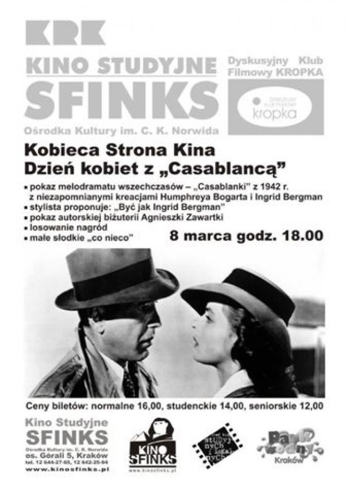Z okazji więta Kobiet, w cyklu Perły Klasyki kobieca strona kina: Casablanca w reż. Michaela Curtisa (melodramat, USA 1942, wyst: Ingrid Bergman, Humphreya Bogart, Paul Henreid)