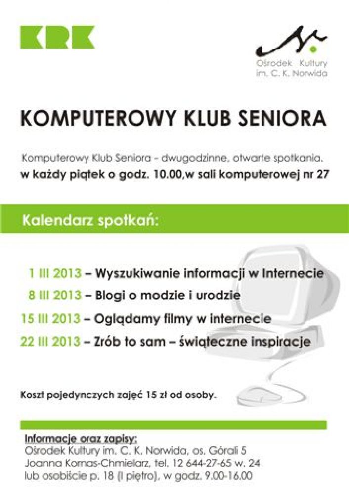 Zapraszamy na warsztaty w ramach KOMPUTEROWEGO KLUBU SENIORA dziaajcego w Orodku Kultury im. C. K. Norwida w Krakowie. Proponujemy ciekawe spotkania w przyjemnej atmosferze przybliajce tajniki pracy z komputerem i Internetem.