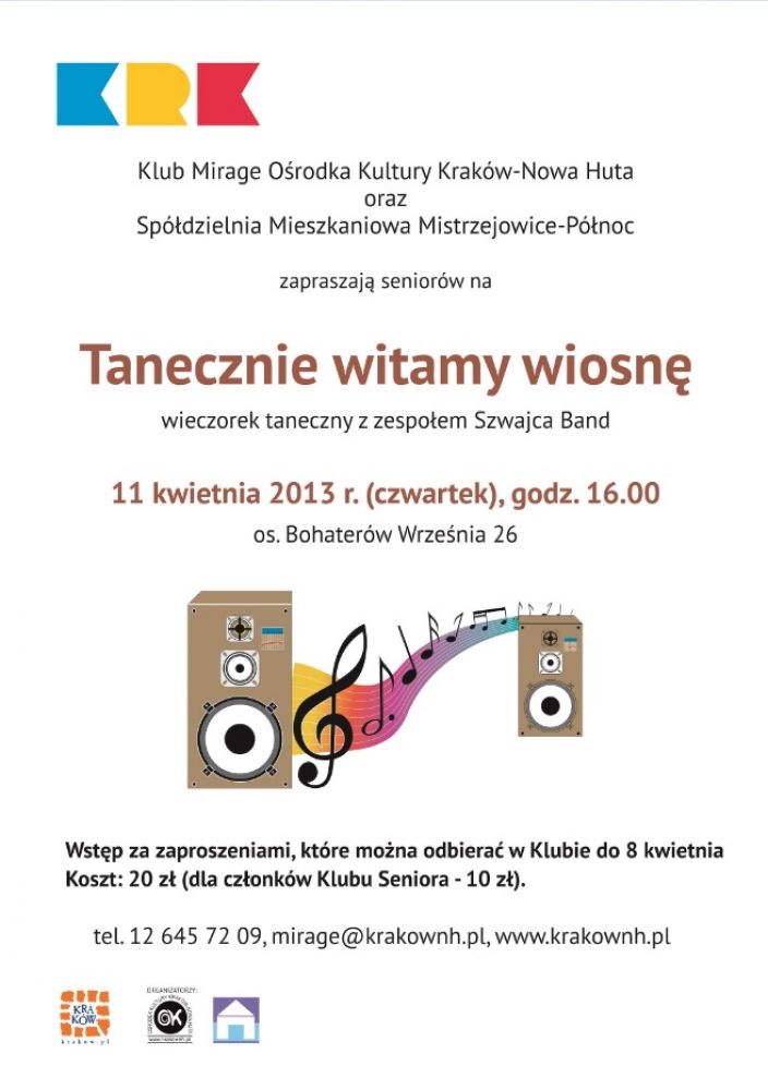 Klub Mirage Oœrodka Kultury Kraków-Nowa Huta (os. Bohaterów Wrzeœnia 26) zaprasza na wieczorek taneczny dla seniorów.