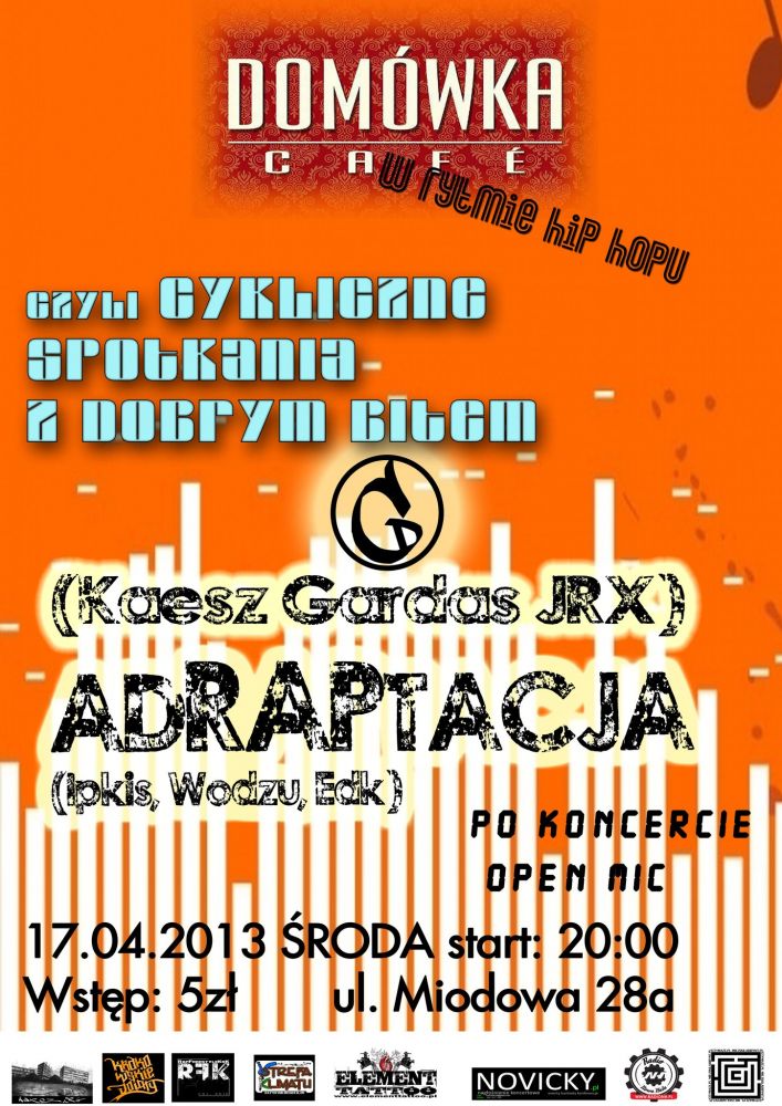 Już po raz drugi Domówka Cafe (ul. Miodowa 28a) udostępnia swojš scenę krakowskim freestylowcom. Tym razem w ramach Domówka w rytmie Hip-Hop czyli cykliczne spotkania z dobrym bitem 17.04 koncert dadzš dwa składy: O.D.C i AdRAPtacja.
