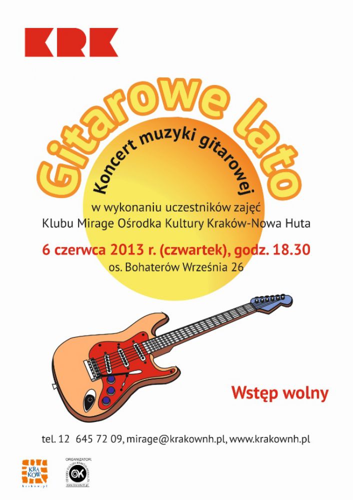 Z okazji zakończenia roku kulturalnego Klub Mirage Oœrodka Kultury Kraków-Nowa Huta (os. Bohaterów Wrzeœnia 26) zaprasza 6 czerwca o godz. 18.30 na koncert uczestników zajęć gitarowych w Klubie.