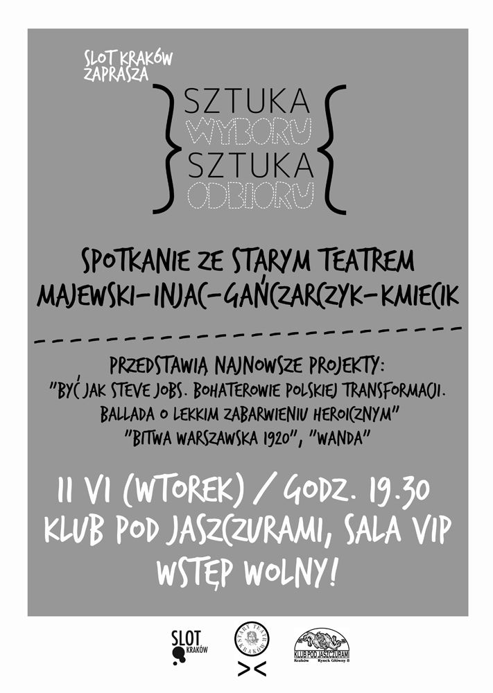 Cykl spotkań SZTUKA WYBORU SZTUKA ODBIORU pod szyldem SLOT Kraków jest rozwinięciem SLOT Festów, które odbywajš się co pół roku, skupiajšc na wspólnej przestrzeni nieprzebranš iloć tematów i form, a także wielu niezwykłych goci. Ponieważ podczas takiego weekendu często nie sposób uczestniczyć we wszystkich wydarzeniach ani skupić się dłużej na jednym temacie, chcemy spotykać się częciej i wnikać głębiej w wybrane tematy.