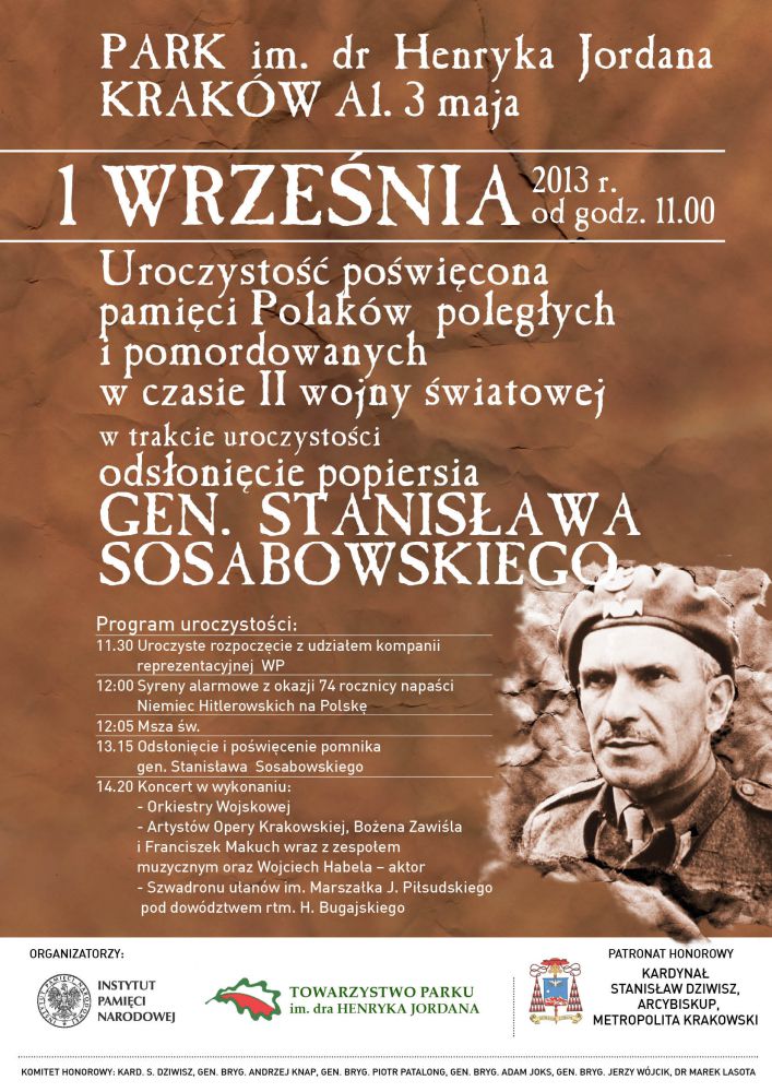 Instytut Pamięci Narodowej Oddział w Krakowie oraz Towarzystwo Parku im. dra Henryka Jordana zapraszajš na uroczystoć powięconš pamięci Polaków poległych i pomordowanych w czasie II wojny wiatowej, w trakcie której nastšpi odsłonięcie popiersia gen. Stanisława Sosabowskiego w galerii Wielkich Polaków.