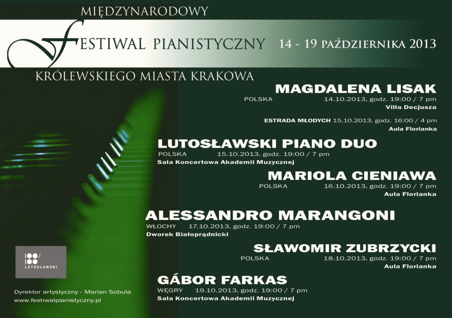 W tym roku po raz kolejny zaprosiliœmy do Krakowa wybitnych pianistów z całej Europy. Wystšpiš przed Państwem Magdalena Lisak, Mariola Cieniawa, Lutosławski Piano Duo, Alessandro Marangoni, Sławomir Zubrzycki, Gábor Farkas – mówi Dyrektor Artystyczny Festiwalu i prezes Stowarzyszenia Artystycznego PianoClassic, Marian Sobula. - Nie byłoby to takie proste, gdyby nie praca wielu znakomitych osób, często pozostajšcych w cieniu artystów oraz pomoc Ministerstwa Kultury i Dziedzictwa Narodowego, Instytutu Muzyki i Tańca, Stołecznego Miasta Krakowa oraz Województwa Małopolskiego.