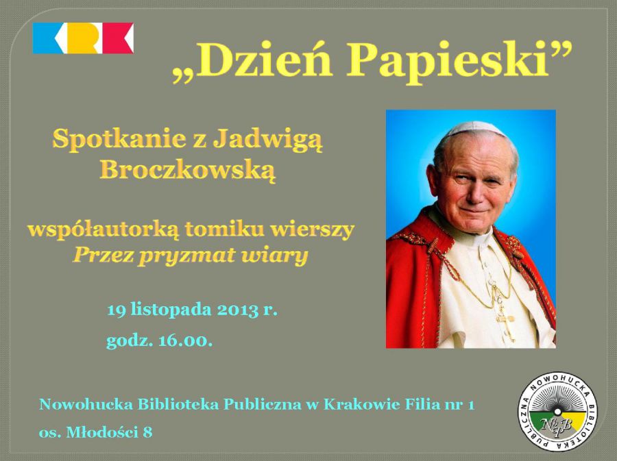 W 2005 r. Sejm Rzeczypospolitej Polskiej ustanowił dzień 16 padziernika więtem Jana Pawła II, tzw. Dniem Papieskim. Chcšc uczcić pamięć Papieża Polaka Biblioteka zorganizowała spotkanie, którego gociem będzie Jadwiga Broczkowska autorka ksišżki "Na karpackich szlakach województwa Małopolskiego" oraz przedstawicielka Podgórskiego Stowarzyszenia Przyjaciół Sztuk Wszelkich im. Karola Wojtyły w Krakowie.