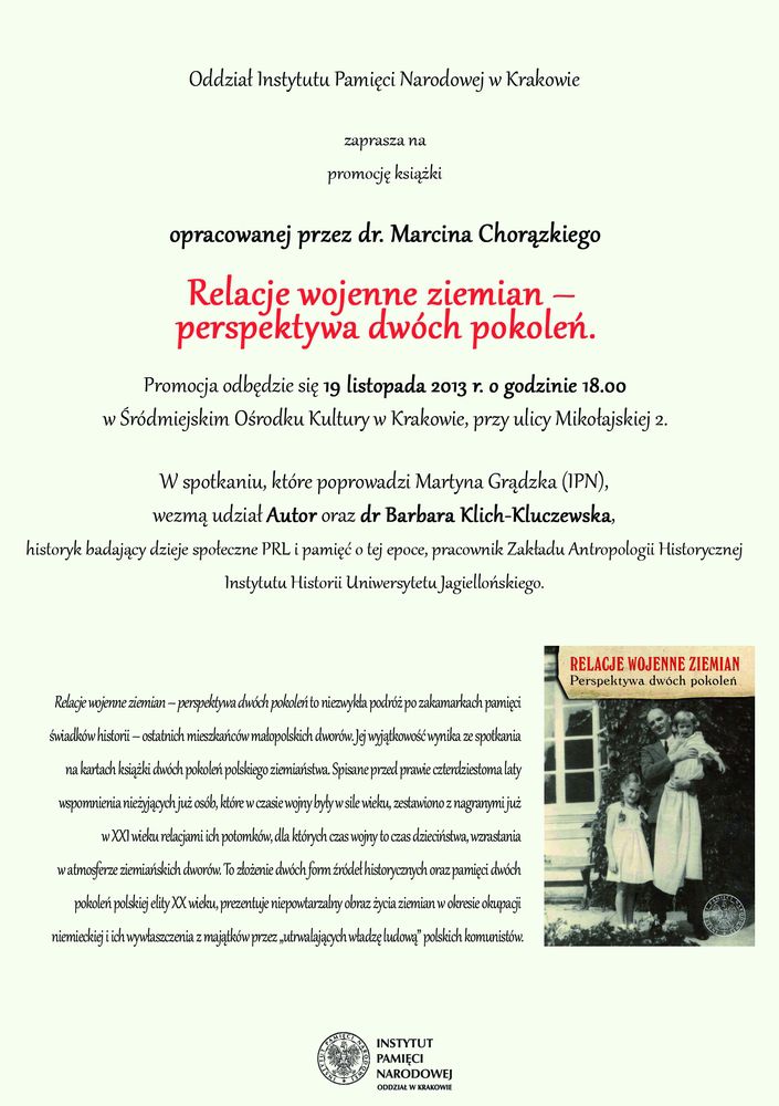 Oddział Instytutu Pamięci Narodowej w Krakowie zaprasza na promocje ksišżki opracowanej przez dr. Marcina Choršzkiego Relacje wojenne ziemian perspektywa dwóch pokoleń.