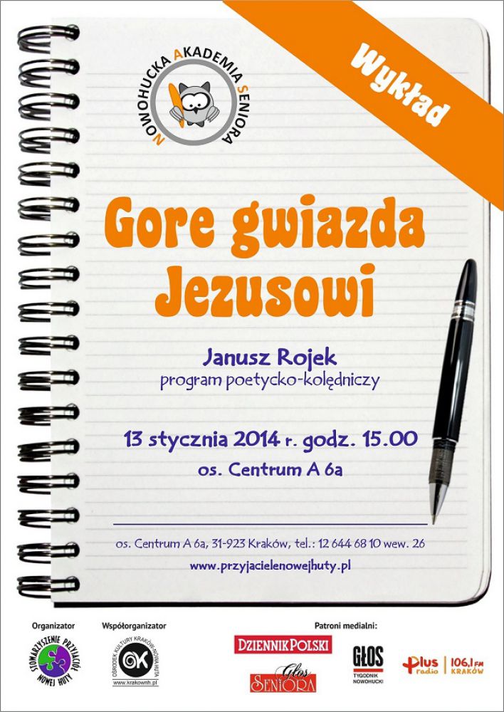 Tym razem Stowarzyszenie Przyjaciół Nowej Huty oraz Oœrodek Kultury Kraków-Nowa Huta zapraszajš słuchaczy Nowohuckiej Akademii Seniora na program poetycko-kolędniczy. Oprócz wspólnego kolędowania przy akompaniamencie gitary, znajdzie się również miejsce na prezentację wierszy i tekstów o tematyce bożonarodzeniowej w wykonaniu Janusza Rojka.