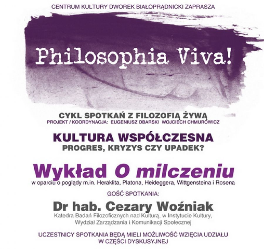 Dworek Białopršdnicki zaprasza na kolejne spotkanie z cyklu Philosophia Viva!. Wspólnie z przedstawicielami różnych rodowisk akademickich w Polsce poszukujemy odpowiedzi na pytanie zawarte w tytule naszego filozoficznego projektu: Kultura współczesna progres, kryzys, upadek?.