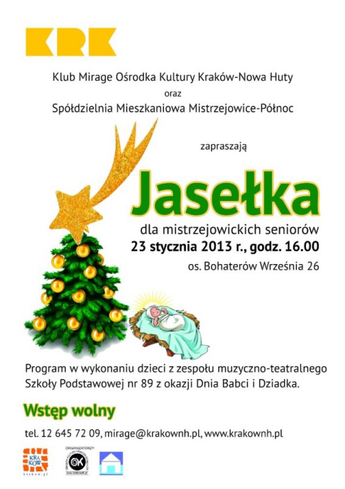 Klub Mirage Oœrodka Kultury Kraków-Nowa Huta (os. Bohaterów Wrzeœnia 26) zaprasza 23 stycznia o godz. 16.00 na Jasełka w wykonaniu dzieci z zespołu muzyczno-teatralnego Szkoły Podstawowej nr 89, a następnie wspólna biesiada.