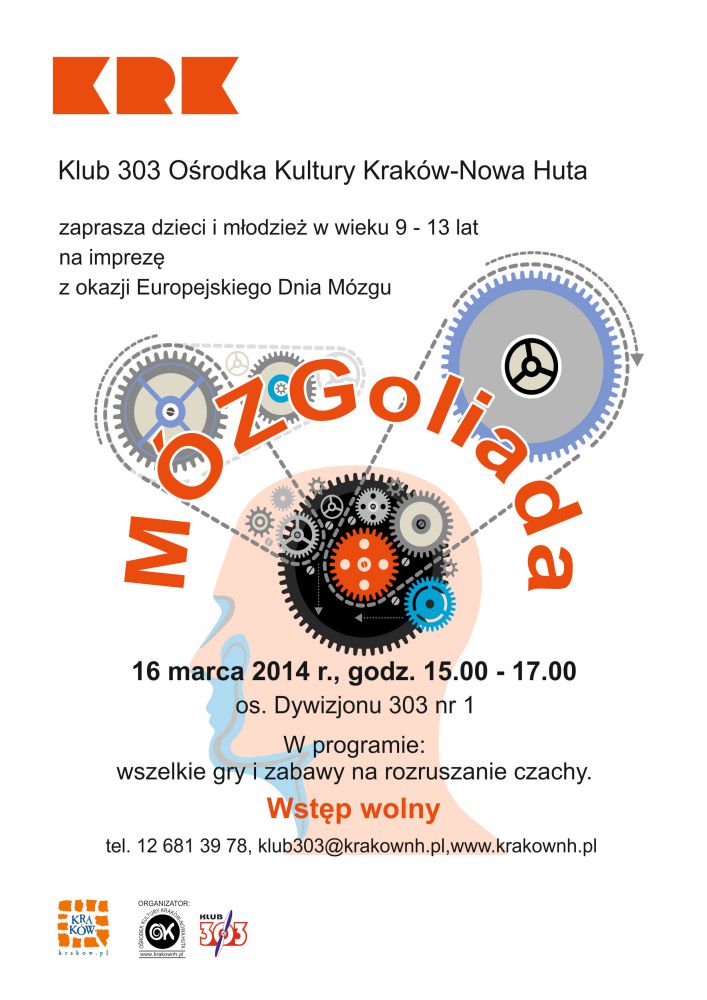 Kalendarz nietypowych œwišt pęka w szwach. Dzień Przytulania, Adoracji, Samotnych, Kota czy Metalowca to tylko niektóre oryginalne œwięta. W gšszczu tych nieszablonowych propozycji obchodzony jest także Europejski Dzień Mózgu, który przypada na 18 marca. W tym roku w obchody Europejskiego Dnia Mózgu włšcza się także Klub 303 Oœrodka Kultury Kraków-Nowa Huta (os. Dywizjonu 303 nr 1), który przygotował z tej okazji specjalnš imprezę.