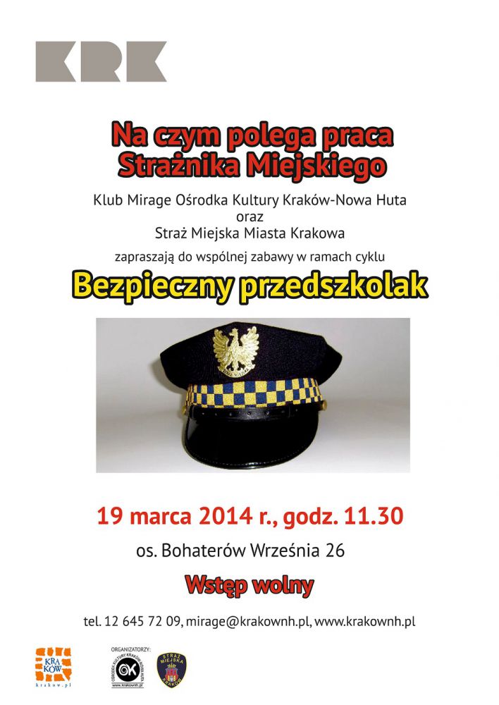 Klub Mirage Oœrodka Kultury Kraków-Nowa Huta (os. Bohaterów Wrzeœnia 26) zaprasza na kolejne spotkanie dla przedszkolaków prowadzone przez Straż Miejskš w ramach cyklu Bezpieczny przedszkolak, które odbędzie się 19 marca o godz. 11.30.
