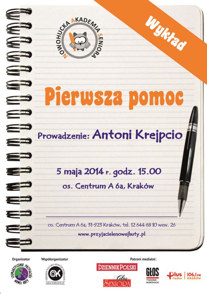 Pierwszy majowy wykład w Nowohuckiej Akademii Seniora poœwięcony będzie zagadnieniom z zakresu podstaw prawnych udzielania pierwszej pomocy i zasadom wzywania służb ratowniczych. Spotkanie poprowadzi ratownik medyczny Antonii Krejpcio, który omówi także niektóre ze stanów zagrożenia życia m.in. zatrzymanie kršżenia, udar mózgu, padaczkę.