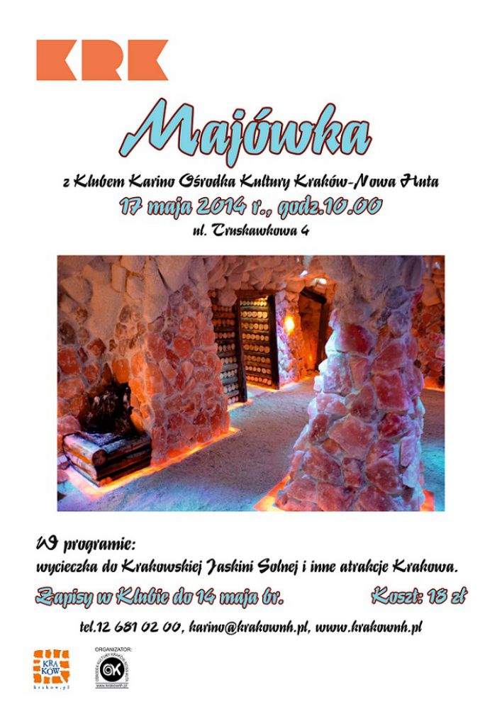 Klub Karino Orodka Kultury Kraków-Nowa Huta (ul. Truskawkowa 4) zaprasza na pierwszš w tym roku wycieczka z cyklu wycieczek po regionie w ramach Klubu Młodego Podróżnika, która odbędzie się 17 maja o godz. 10.00. W programie znajdzie się pobyt w Krakowskiej Jaskini Solnej oraz zwiedzanie Smoczej Jamy. Nie zabraknie również odpoczynku i posiłku na statku-restauracji u podnóża Wzgórza Wawelskiego przy mocie Dębnickim. Podczas kolejnych wycieczek uczestnicy poszukiwać będš miejsc ciekawych pod względem etnograficznym (folklor, kultura, obyczaje). Zapisy w Klubie do 14 maja (tel. 12 681 02 00, karino@krakownh.pl).
