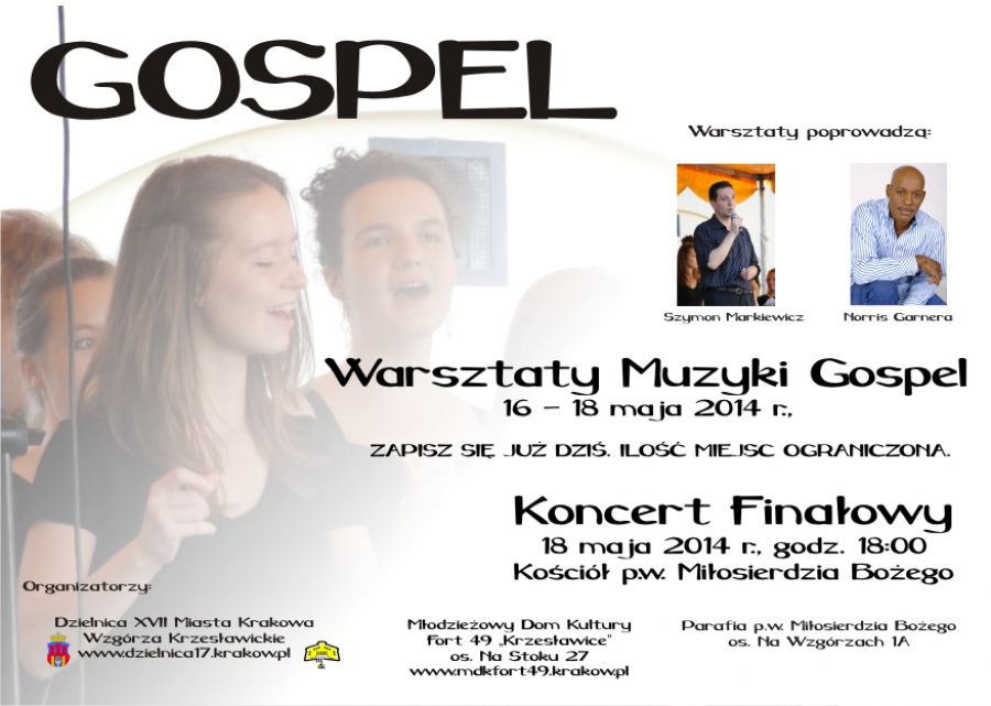 Młodzieżowy Dom Kultury Fort 49 Krzesławice w Krakowie zaprasza wszystkich tych dla, których piewanie jest radociš i chęciš wyrażaniem siebie, na warsztaty Muzyki Gospel, które odbędš się w dniach od 16 do 18 maja 2014 roku. Uczestnicy będš mieli niecodziennš okazję piewać pod kierunkiem Szymona Markiewicz oraz Norrisa Garnera. Wydarzenie zakończone zostanie koncertem finałowym w Kociele p.w. Miłosierdzia Bożego, os. Na Wzgórzach 1A w Krakowie, na który serdecznie zapraszamy w dn. 18 maja 2014 roku o godz. 18:00.