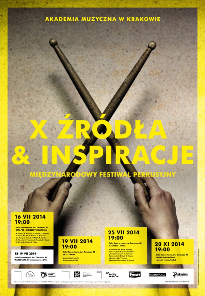 Po raz kolejny, już dziesišty, a zarazem drugi w lipcu, odbędzie się Międzynarodowy Festiwal Perkusyjny „ródła i Inspiracje”. Festiwal poprzedzony będzie III edycjš Kursów Perkusyjnych ASTAPER, prowadzonych wspólnie przez cztery europejskie uczelnie muzyczne: Musik Hohschule Freiburg, Conservatorio Superior J. Rodrigo z Valencji, Conservatorio C. Pollini z Padwy i Akademię Muzycznš z Krakowa. Jednym z elementów Festiwalu będzie koncert przygotowany przez uczestników kursów, studentów tychże uczelni, pod okiem wybitnych pedagogów – perkusistów, profesorów: Bernharda Wulffa, Massimo Pastore i Jana Pilcha. Przez dwa lipcowe tygodnie Akademia Muzyczna w Krakowie będzie rozbrzmiewać muzykš perkusyjnš w międzynarodowym wykonaniu. Z zaproszonych goœci usłyszymy i zobaczymy – bo aspekt wizualny jest nieodłšcznš atrakcjš muzyki perkusyjnej – wybitnych przedstawicieli różnych odmian muzyki perkusyjnej.