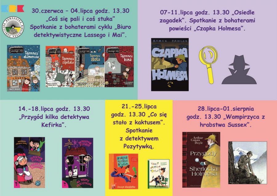 W Filii nr 7 Nowohuckiej Biblioteki Publicznej w Krakowie w ramach Akcji Lato 2014 w dniach 30 VI 1 VIII 2014 młodzi miłonicy powieci detektywistycznych spotkajš się 25 razy by wysłuchać przygód ulubionych bohaterów i rozwišzywać zagadki kryminalne. W dniach od 21.07-25.07. 2014 r. o godz.13.30 czytane będš detektywistyczne opowiadania Grzegorza Kasdepke. Jeli chcesz się spotkać z detektywem Pozytywkš przyjd do Biblioteki, by wspólnie wyjanić zagadkę.