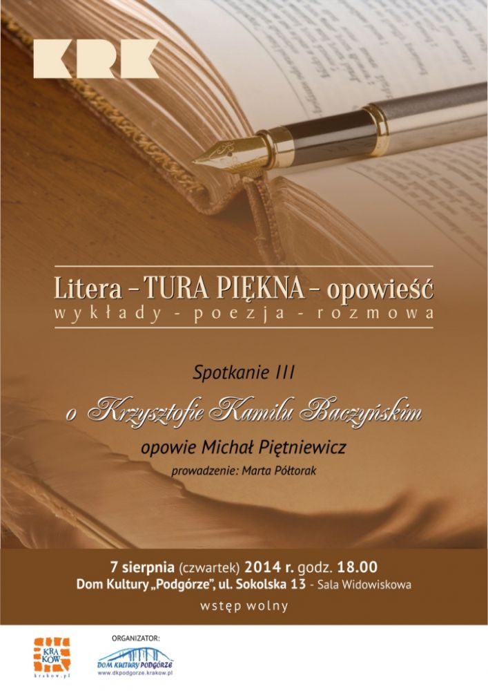 Litera TURA PIĘKNA opowieć to nowy cykl spotkań z poezjš znanych i lubianych twórców w formie krótkiego wykładu o twórczoci omawianego pisarza, analizy kilku utworów przez publicznoć w formie dyskusji oraz wieczoru poezji.