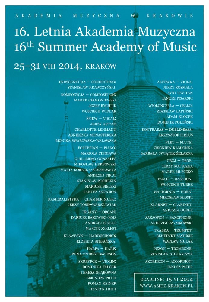 W poniedziałek 25 sierpnia o godzinie 19:00 w Auli Florianka (ul. Basztowa 8) koncertem kameralnym Akademia Muzyczna w Krakowie zainauguruje 16. Letniš Akademię Muzycznš. Każdego roku, przez ostatni tydzień sierpnia, młodzi muzycy, studenci i absolwenci akademii muzycznych, uczniowie szkół muzycznych oraz nauczyciele szkolnictwa muzycznego majš okazję doskonalić swój warsztat wykonawczy pod okiem renomowanych profesorów z kraju i zagranicy. Pomysłodawcš oraz dyrektorem artystycznym Letniej Akademii Muzycznej jest pianista, prof. Andrzej Pikul, kierownik Katedry Fortepianu krakowskiej Akademii Muzycznej.