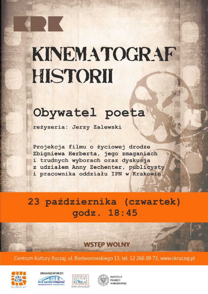Projekcja filmu w reyserii Jerzego Zalewskiego o yciowej drodze Zbigniewa Herberta, jego zmaganiach i trudnych wyborach oraz dyskusja z udziaem Anny Zechenter, publicysty i pracownika oddziau IPN w Krakowie.