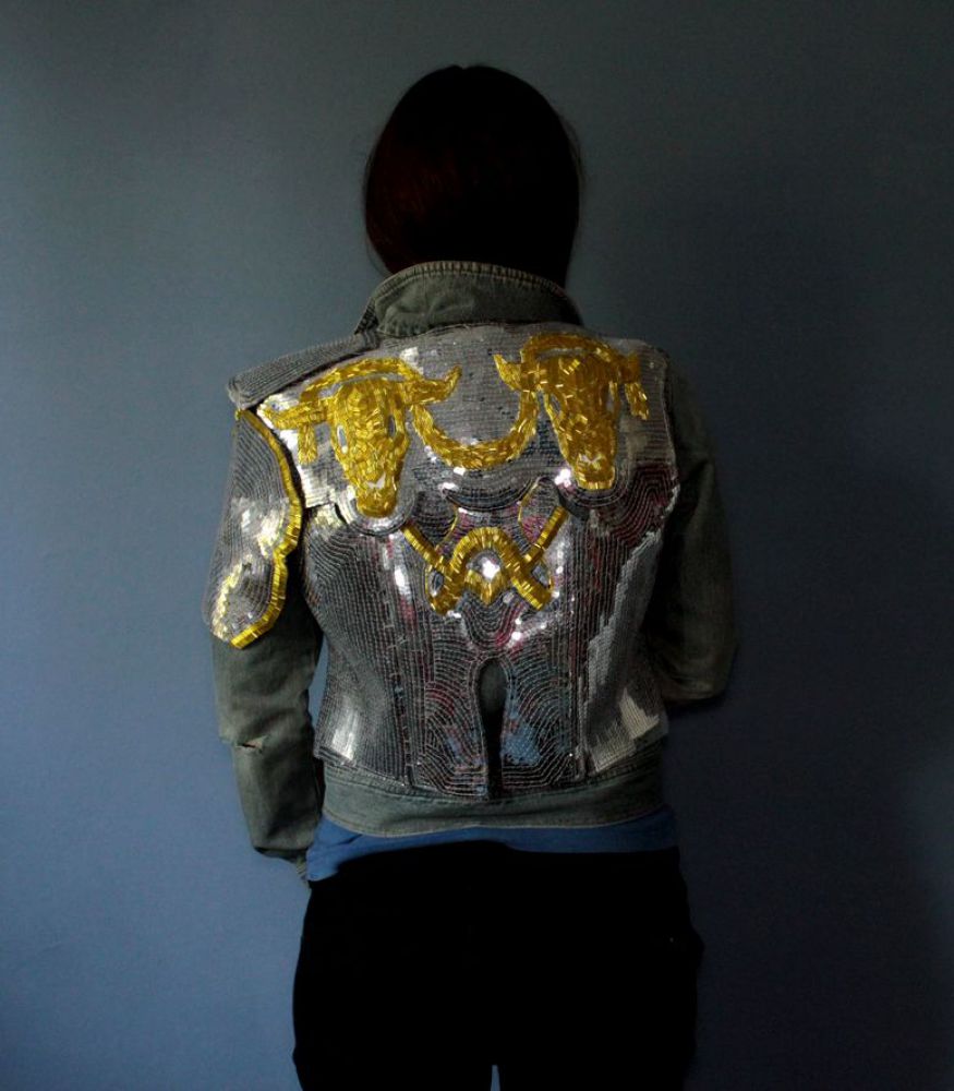 Medium w jakim artystka obecnie realizuje swoje prace to haft cekinami.
